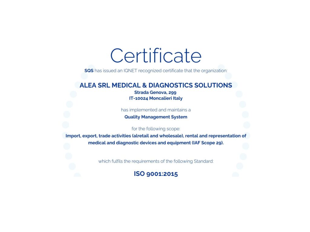 ALEA S.r.l. è una società italiana, con sede in Moncalieri (TO) nata grazie all’esperienza trentennale nel settore medicale e sanitario dei soci fondatori. Molteplici i settori di competenza: sistemi infusionali, consumabili per reparti ospedalieri, dispositivi per diagnostica di laboratorio e apparecchiature elettromedicali.